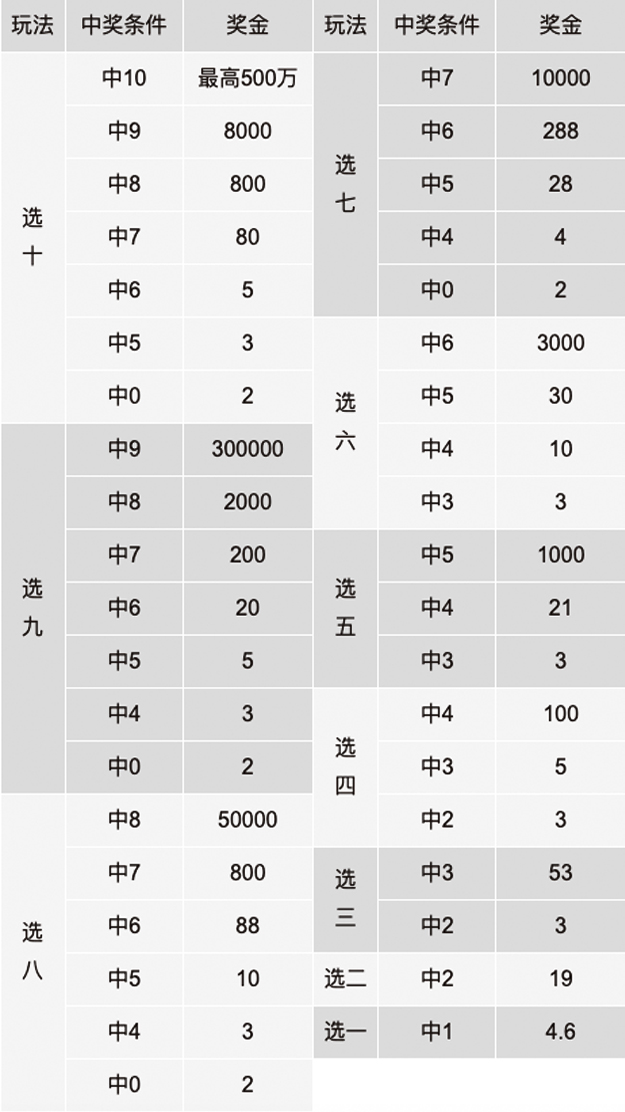 “选十”玩法中,当期“选十中十”奖等的奖金总额为“选十”玩法销售额计提的当期奖金减去“选十”玩法当期实际中出的固定奖奖金总额后,与“选十”玩法奖池资金之和,单注奖金按注均分,并以元为单位取整计算,单注奖金最高封顶500万元。