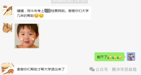 十年寒窗终不负,一生韶华亦可期。2024年4月,嘉怡凭着逆天改命的顽强努力,成功被某地人民检察院录取,成为了一名自豪的检察官。嘉怡公考上岸后的第一件事就是发信息把这个好消息告诉了爷爷和民政工作人员,信息里她这样说:“嬢嬢,我考上检察院啦。很感激你们的帮助让我重回校园完成学业。”“也谢谢你们帮我照顾爷爷,今后我也会用自己的方式,为那些需要帮助的人提供支持和关爱。”像嘉怡这样类似经历的孩子还很多,他们也会经常和“民政姐姐”们聊聊学习、聊聊生活的琐碎。