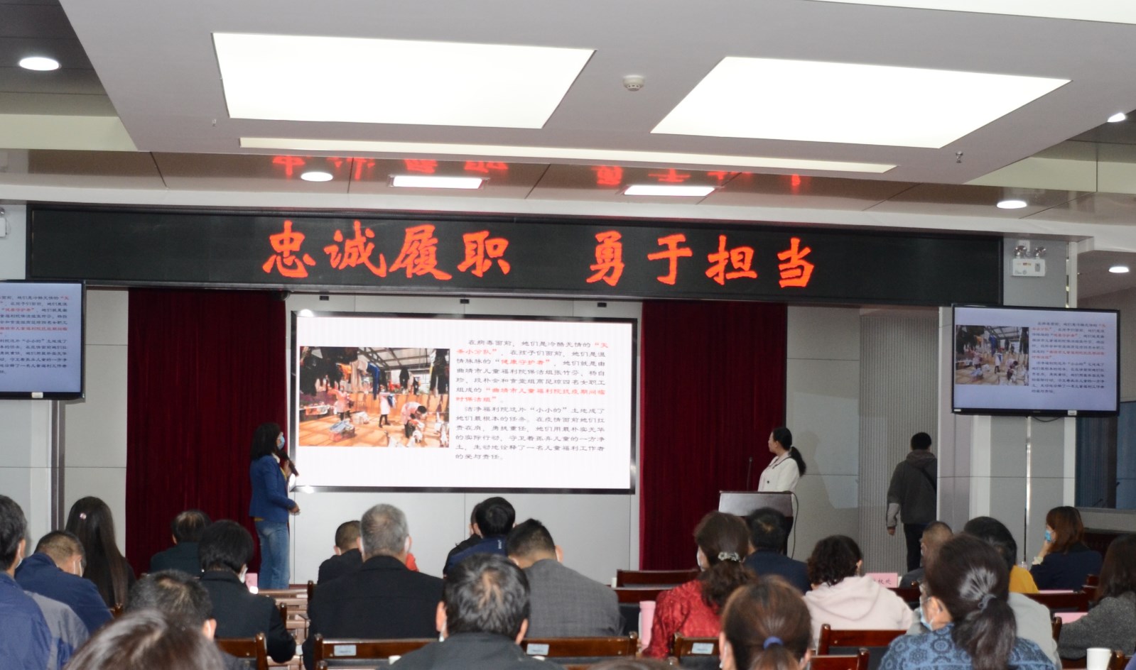 道德讲堂以“忠诚履职 勇于担当”为主题,大家共同诵读了阐述“忠诚、担当”的古语,领悟忠诚、担当的深刻内涵。金江路社区居委会主任李敏同志分享了社区工作者和志愿者在抗疫第一线的感人故事:面对疫情,社区工作者和志愿者临危受命、挺身而出,舍小家、为大家,守住了外防输入、内防扩散的防线,在防控疫情、维护人民群众生命安全中不忘初心、牢记使命,当先锋、做表率,用自己的辛劳和坚守、奉献和汗水织就了抵御疫情的严密防线。厅儿童福利处副处长邵丽萍同志讲述了在疫情下坚守的曲靖市儿童福利院保洁组“净”土女卫士们的事迹:曲靖市儿童福利院保洁组的四名女同志忠诚履职,以“舍小我为孩子、舍小家为大家”的大爱展现了善良与责任、彰显了初心和使命,在疫情面前扛责在肩,勇挑重任,用最朴实无华的实际行动,守卫着孤弃儿童的一方净土。大家一致认为,两位分享者所讲述的故事就是广大民政战线工作者忠诚履职、勇于担当的真实写照。当前,我国疫情防控向好态势进一步巩固,但周边国家疫情持续蔓延,我省“外防输入”的形势异常严峻复杂,脱贫攻坚兜底保障各项工作到了最紧要的关头、最关键的时候。作为一名民政人,必须认真贯彻落实习近平总书记的重要指示精神,聚焦脱贫攻坚,聚焦特殊群体,聚焦群众关切,进一步强信心、聚民心、暖人心,以担当诠释忠诚,以实干践行使命,扎实做好民政领域“六稳”“六保”相关工作,全力做好脱贫攻坚兜底保障各项工作,坚决打赢脱贫攻坚这场硬战!
